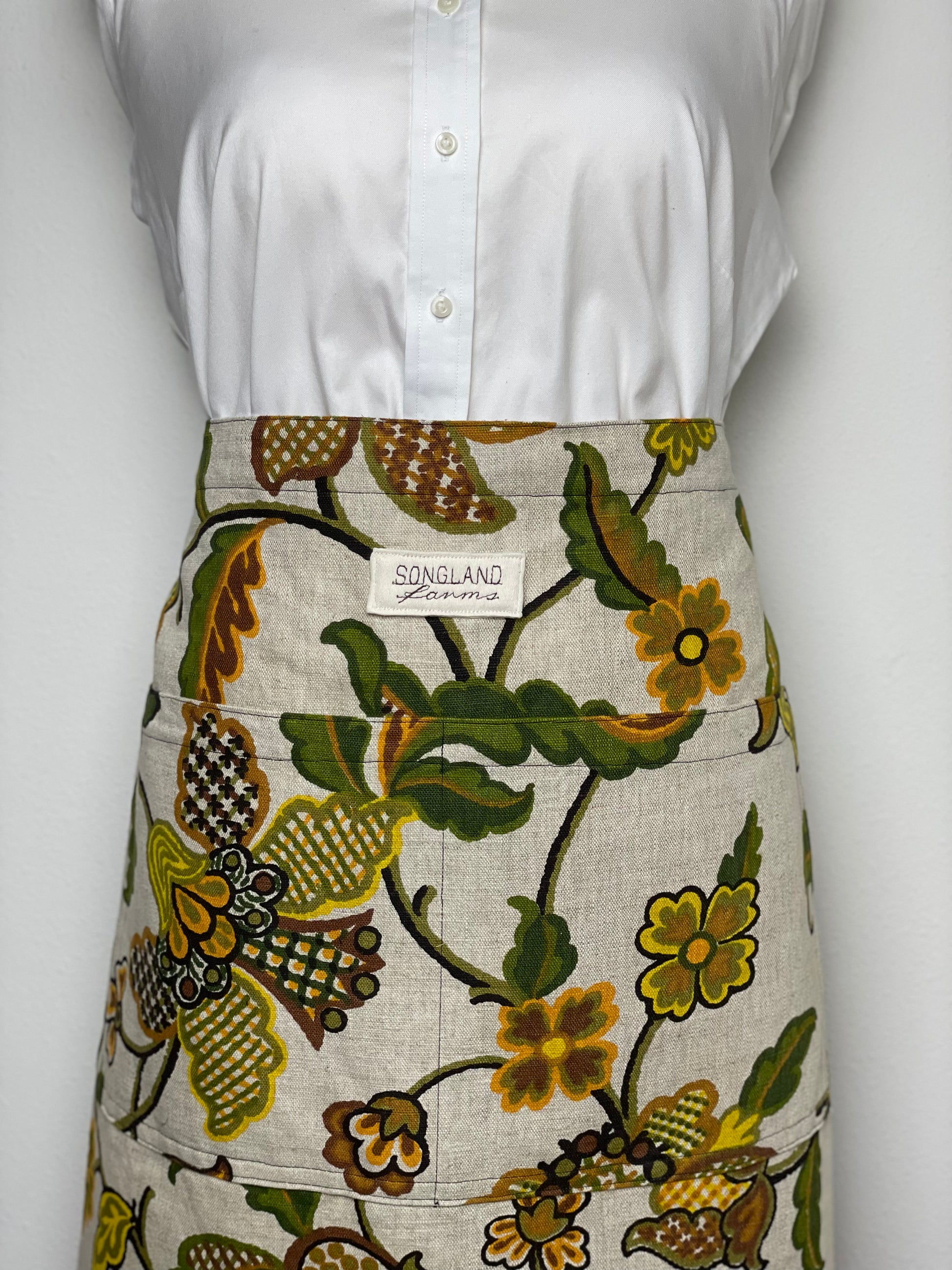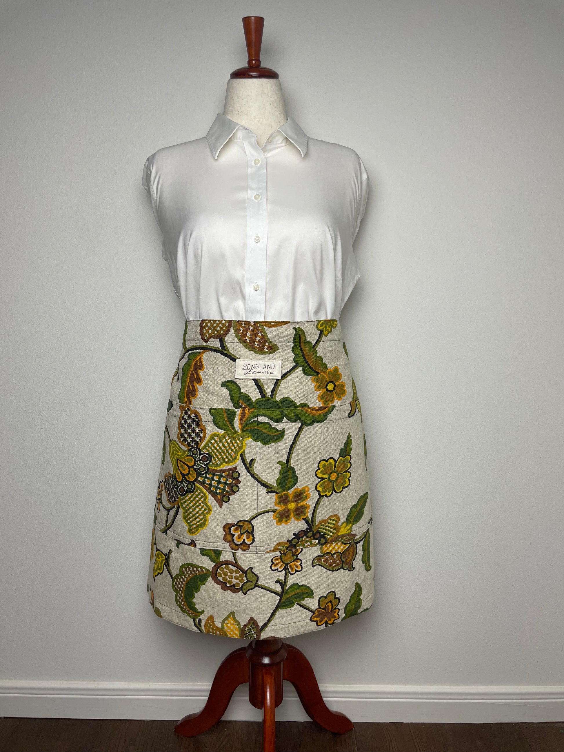 Handmade from vintage Waverly “Coventry Crewel” linen fabric in warm tones of gold, olive, chartreuse, brown, and soft natural beige. The pattern features classic faux-crewel motifs with stylized flowers, leafy branches, and embroidered-look detailing that gives the textile a rich, handcrafted character. The linen fabric has a textured, substantial feel that holds its shape well for everyday kitchen use. Made using repurposed fabric, it blends a traditional Waverly crewel-style print with a clean, functional design.