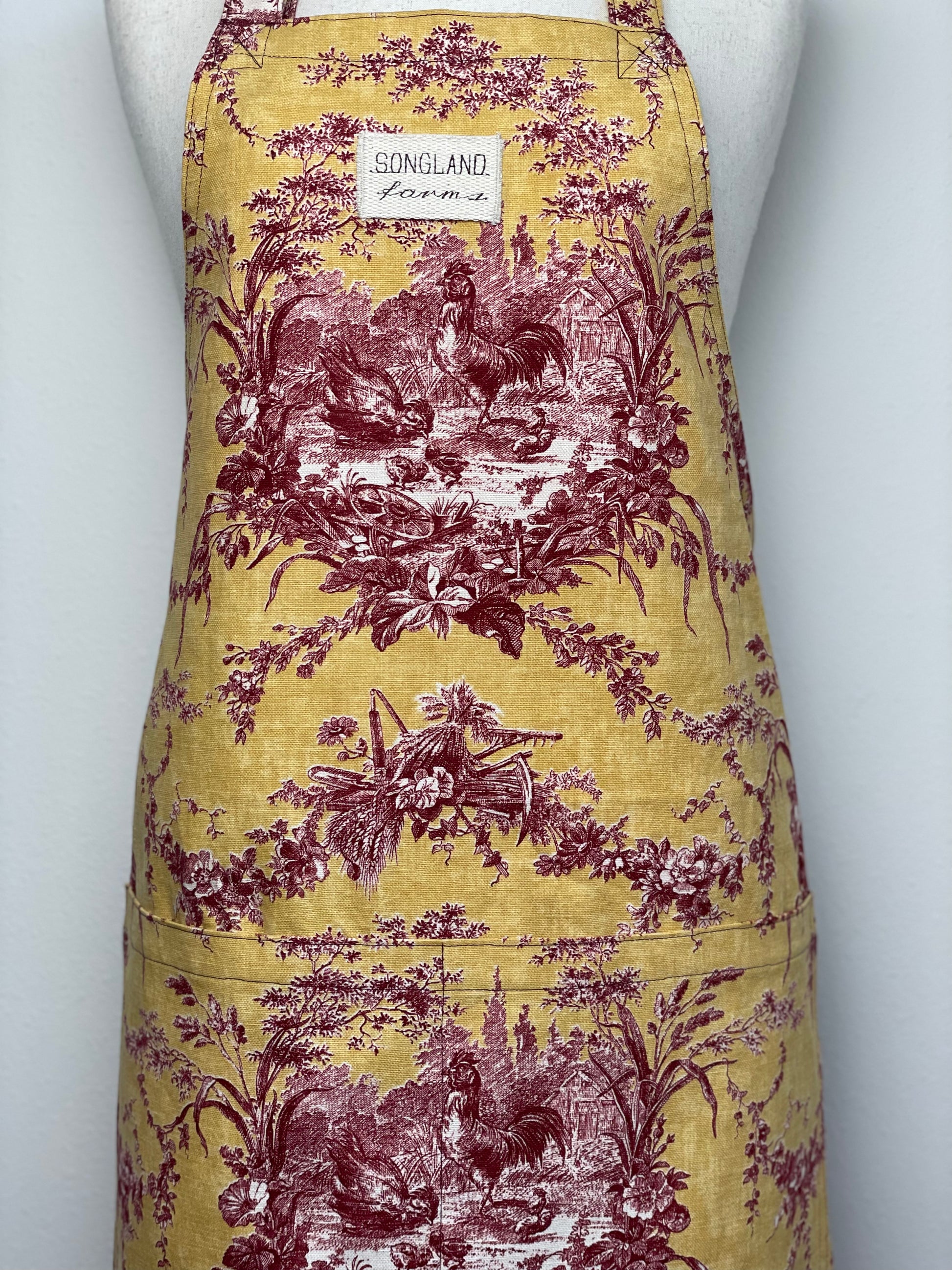 Handmade from vintage cotton Waverly fabric in warm mustard yellow and deep red. The pattern features pastoral toile scenes with roosters, hens, trees, and floral framing, creating a classic French-country look with rich detail. The cotton has a comfortable weight and drapes well while remaining durable for cooking or craft work. Made using repurposed fabric, it blends a traditional farm-toile textile with a clean, functional design suited for daily tasks.