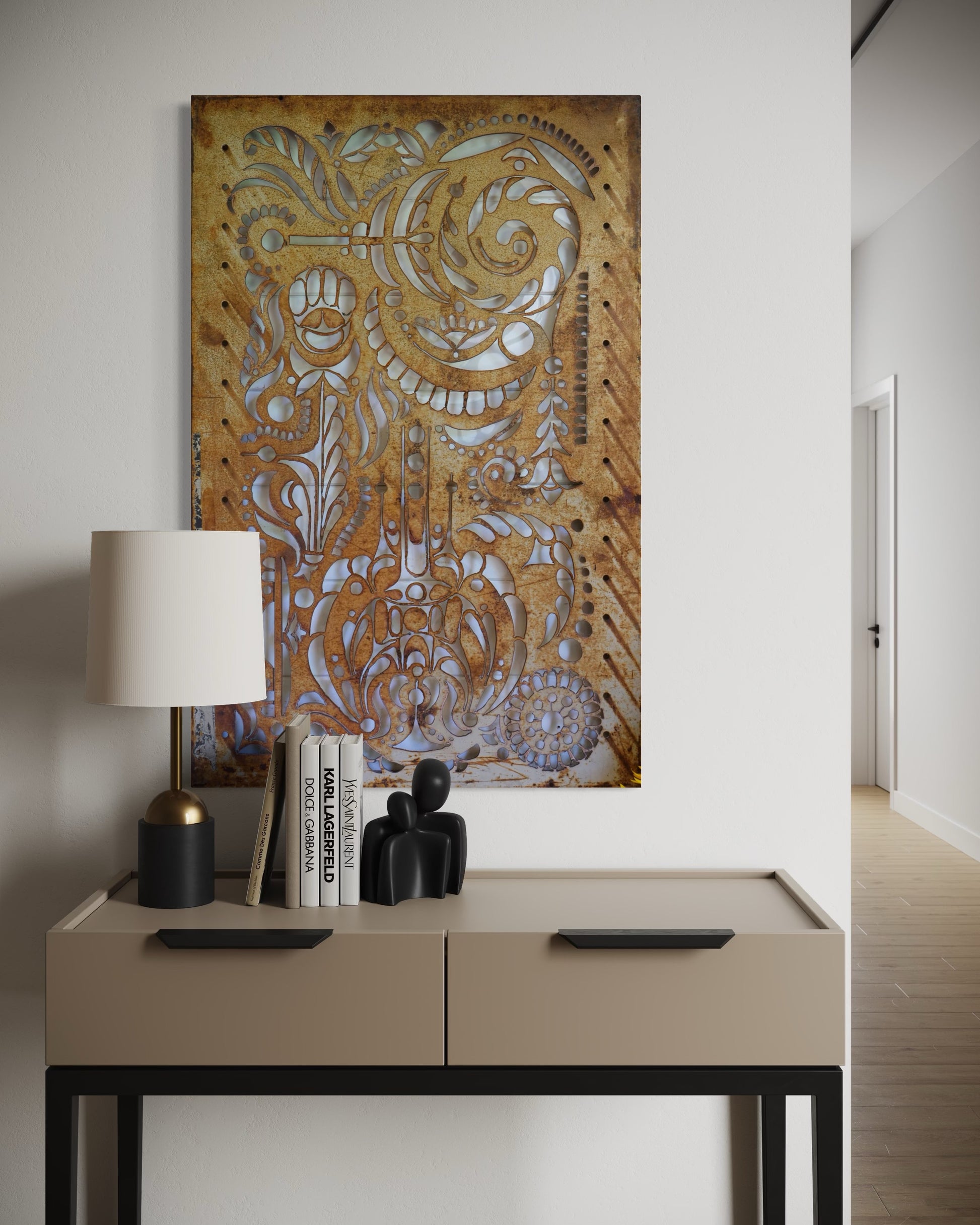 Plasma-Cut Art Nouveau Abstract on vintage shelf canvas. Gold Rust patina.