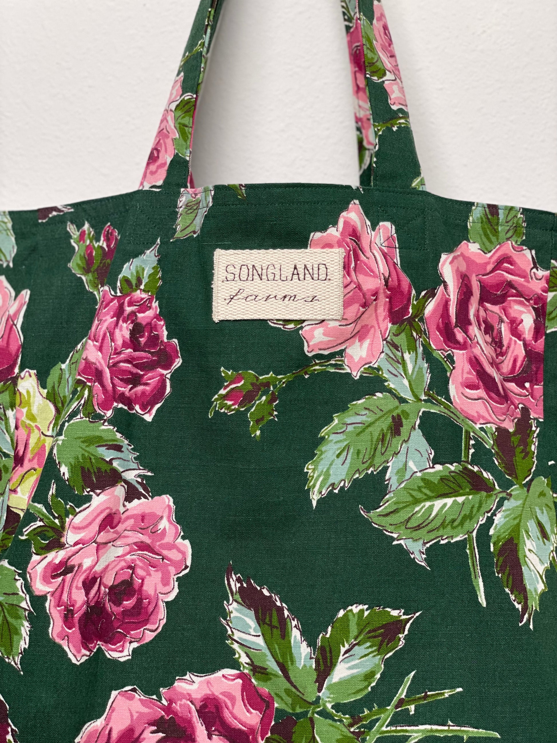 Handmade from vintage floral cotton fabric in deep forest green, soft pink, blush rose, and leafy green, this tote is fully lined and built for everyday use. The print features large, painterly roses with layered petals and detailed foliage, giving the fabric a classic garden-inspired look. The bold contrast between the dark background and bright blossoms makes the pattern feel both romantic and striking. Made using repurposed fabric, it blends a timeless floral textile with a clean, functional design perfect for groceries, books, or daily essentials.