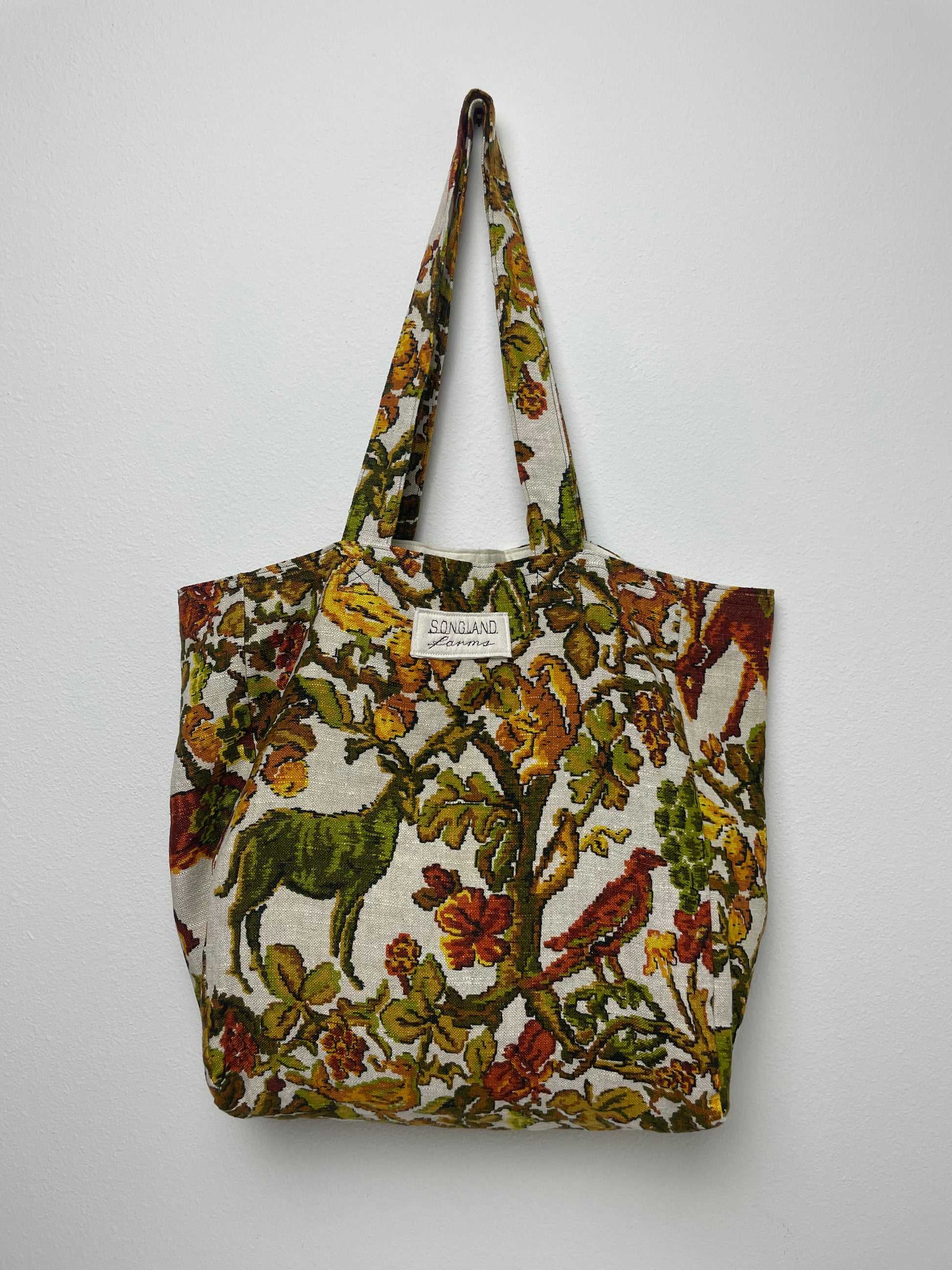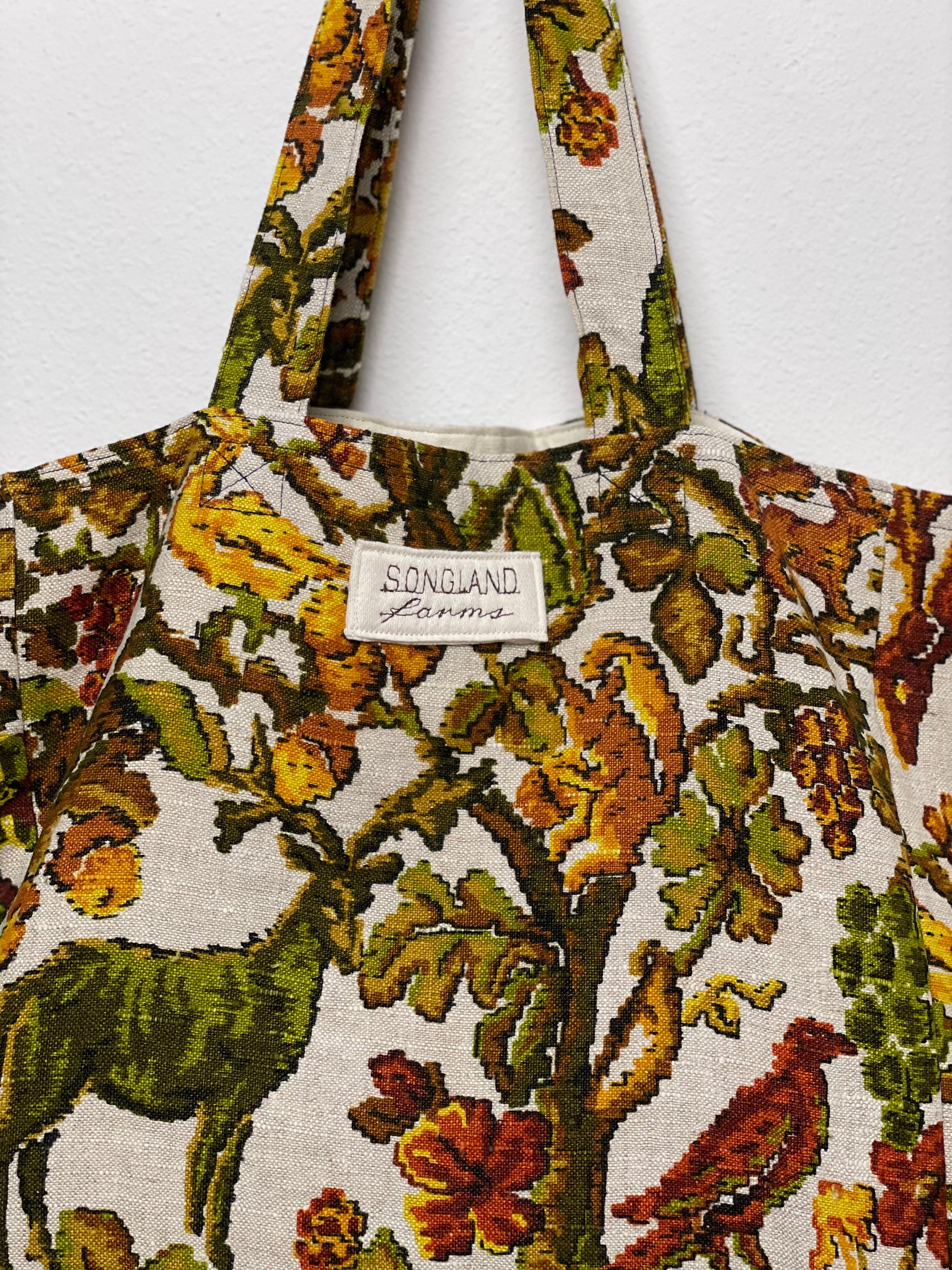 Handmade from vintage Fifth Avenue linen fabric in warm shades of olive green, rust, golden yellow, and soft brown, this tote is fully lined and built for everyday use. The print features a detailed woodland scene with deer, perched birds, twisting branches, and fall foliage, giving the fabric a rich, storybook feel. The natural linen texture softens the colors and adds a rustic, organic look while still keeping the shape structured and practical. Made using repurposed fabric, it blends a nature-inspired textile with a clean, functional design perfect for groceries, books, or daily essentials.
