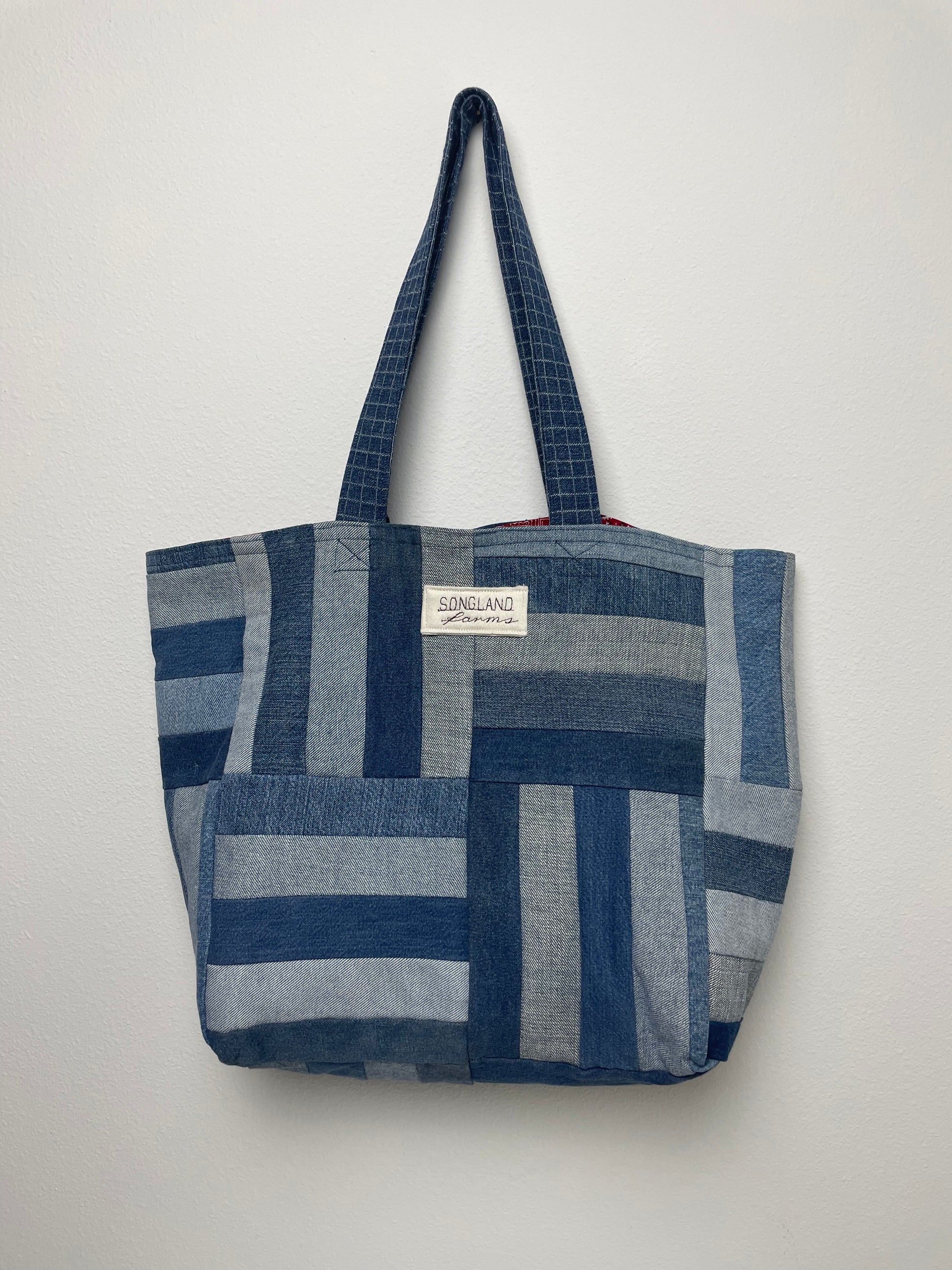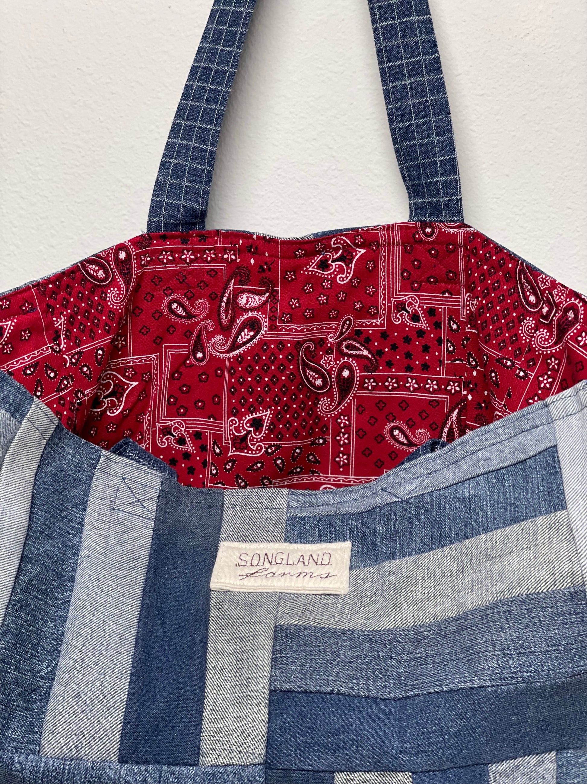 Handmade from vintage denim quilt cotton fabric in mixed shades of indigo, slate blue, and soft gray, this tote is fully lined and built for everyday use. The patchwork-style pattern features alternating strips of denim in varied tones, creating a subtle geometric layout with a classic, lived-in feel. Inside, a bright red bandana lining adds a pop of color and a hint of Western character. Made using repurposed fabric, it blends a rugged, Americana-inspired textile with a clean, functional design perfect for groceries, books, or daily essentials.