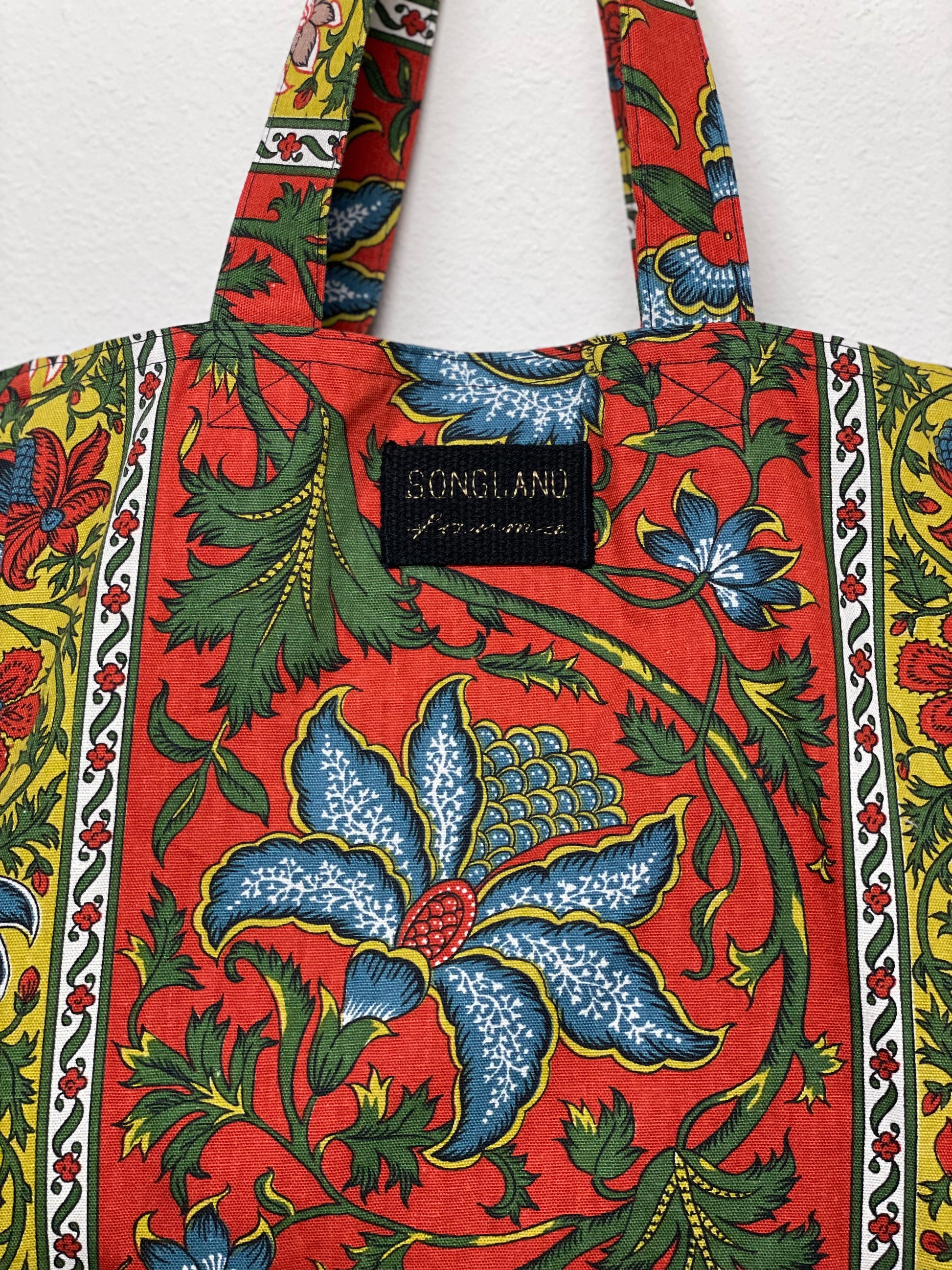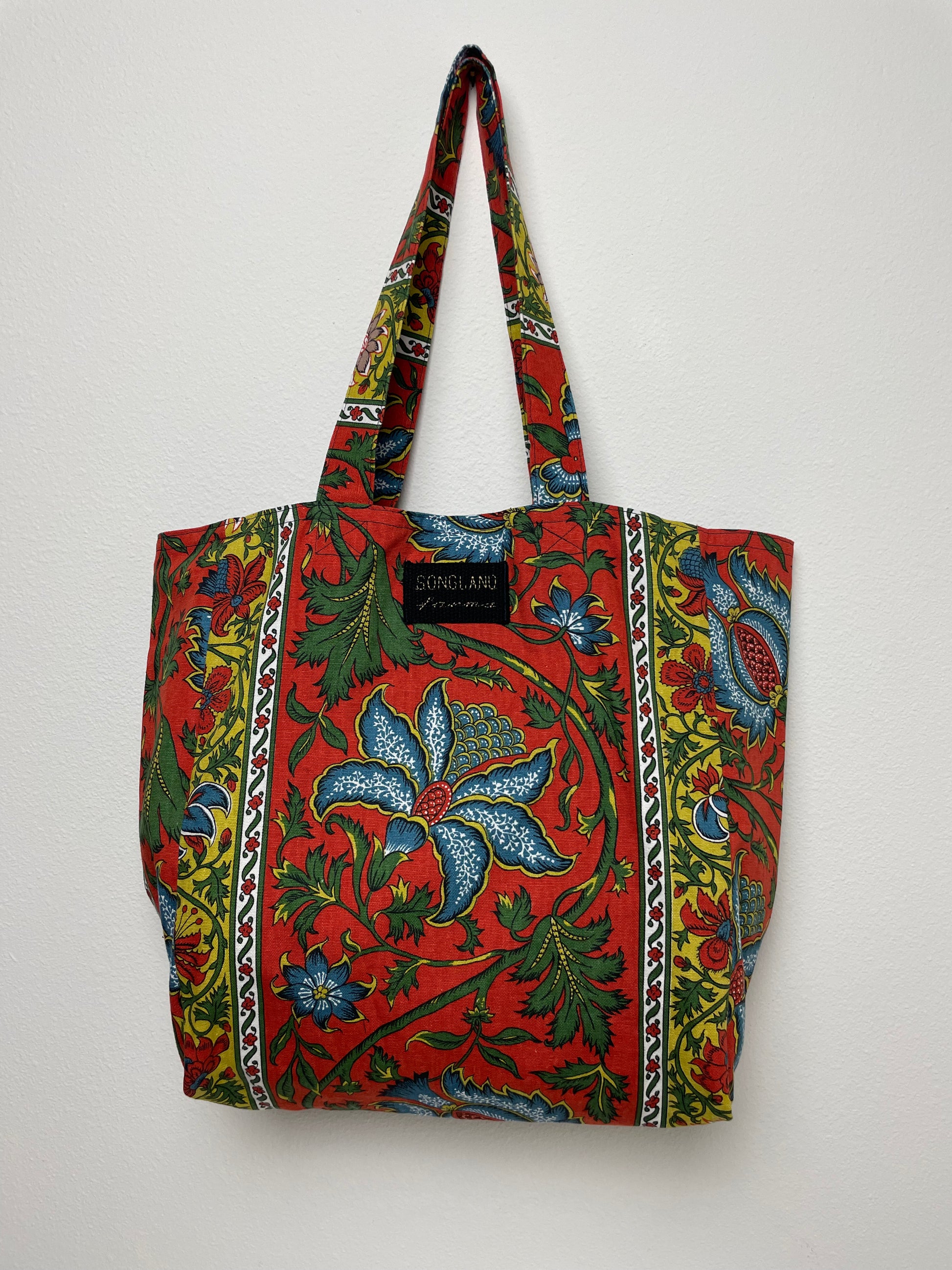 Handmade from vintage Schumacher “Dorian Stripe” cotton fabric in a rich palette of brick red, denim blue, leaf green, and golden yellow, this tote is fully lined and built for everyday use. The Jacobean and Indienne inspired print features sweeping florals, stylized leaves, and decorative borders that frame the pattern with classic textile detail. Bold blue blossoms anchor the design, while smaller flowers and curling vines add movement and depth. Made using repurposed fabric, it blends a traditional, ornamental style with a clean, functional shape perfect for groceries, books, or daily essentials.