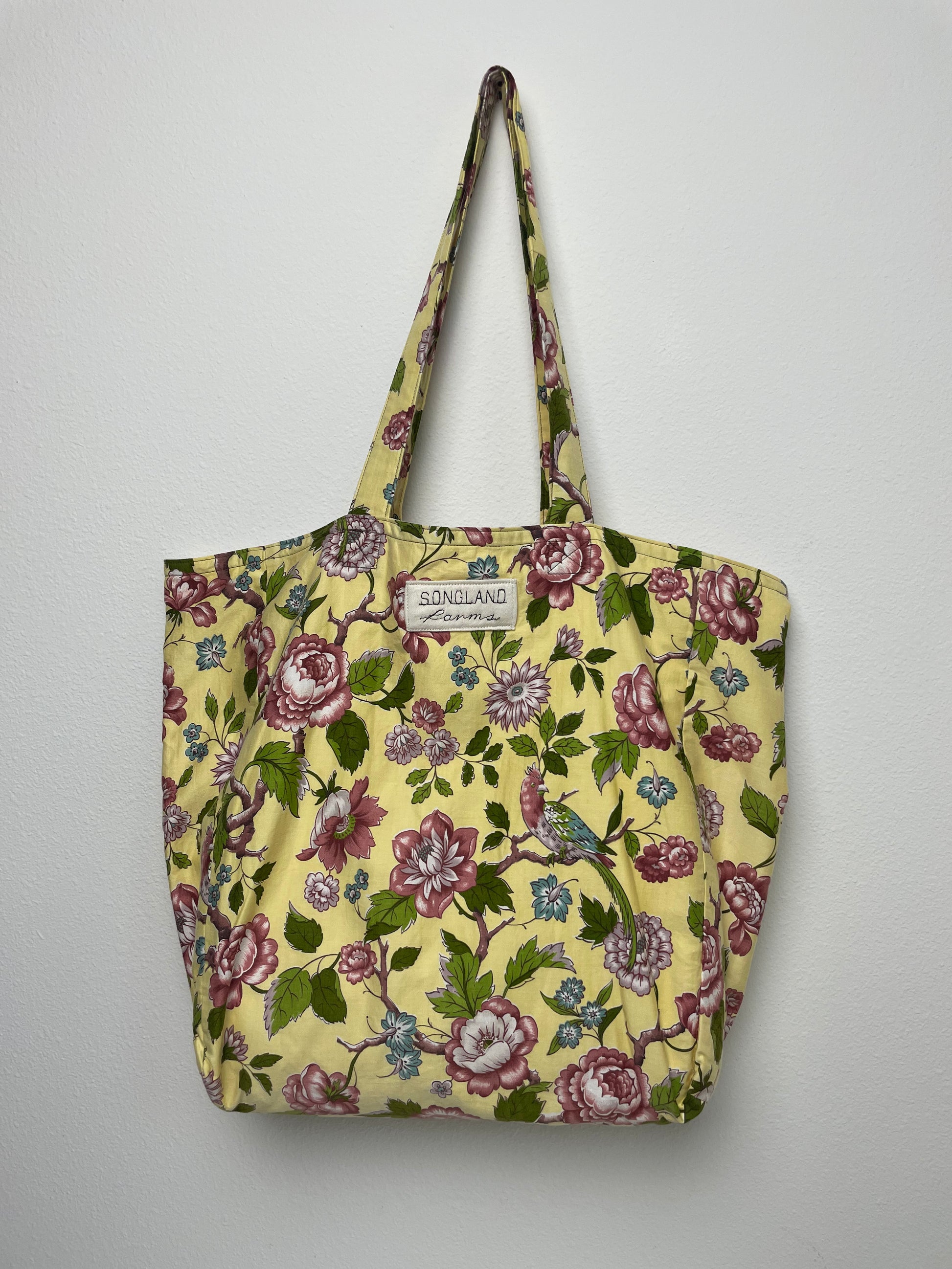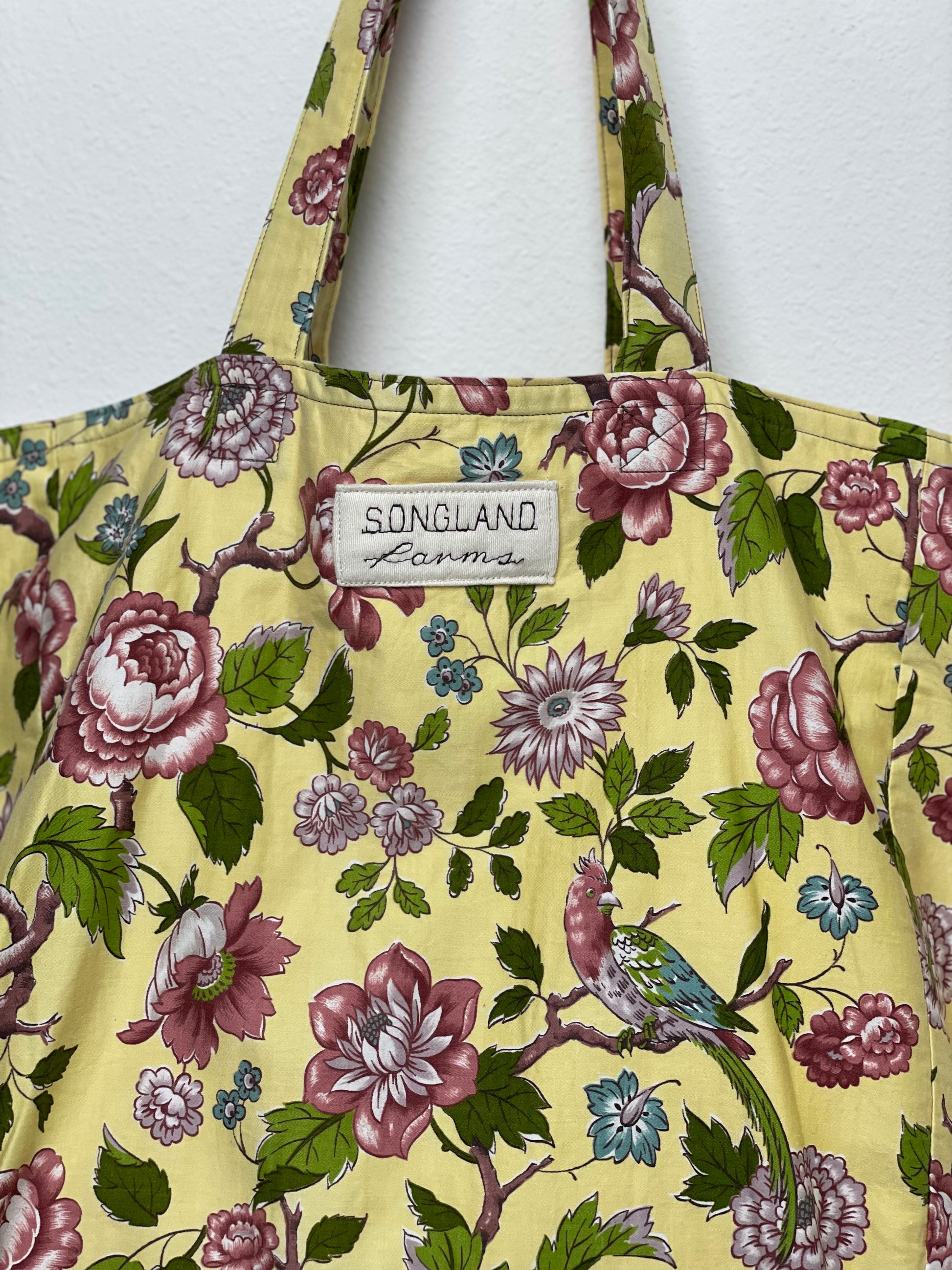 Handmade from vintage Waverly cotton fabric in soft butter yellow, rose pink, sage green, and sky blue, this tote is fully lined and built for everyday use. The print features classic chintz-style florals with branching stems, layered blossoms, and a small perched bird that adds a charming, storybook touch. The warm yellow background gives the pattern a bright, cheerful feel while keeping the look traditional and refined. Made using repurposed fabric, it blends a timeless Waverly floral with a clean, functional design perfect for groceries, books, or daily essentials.
