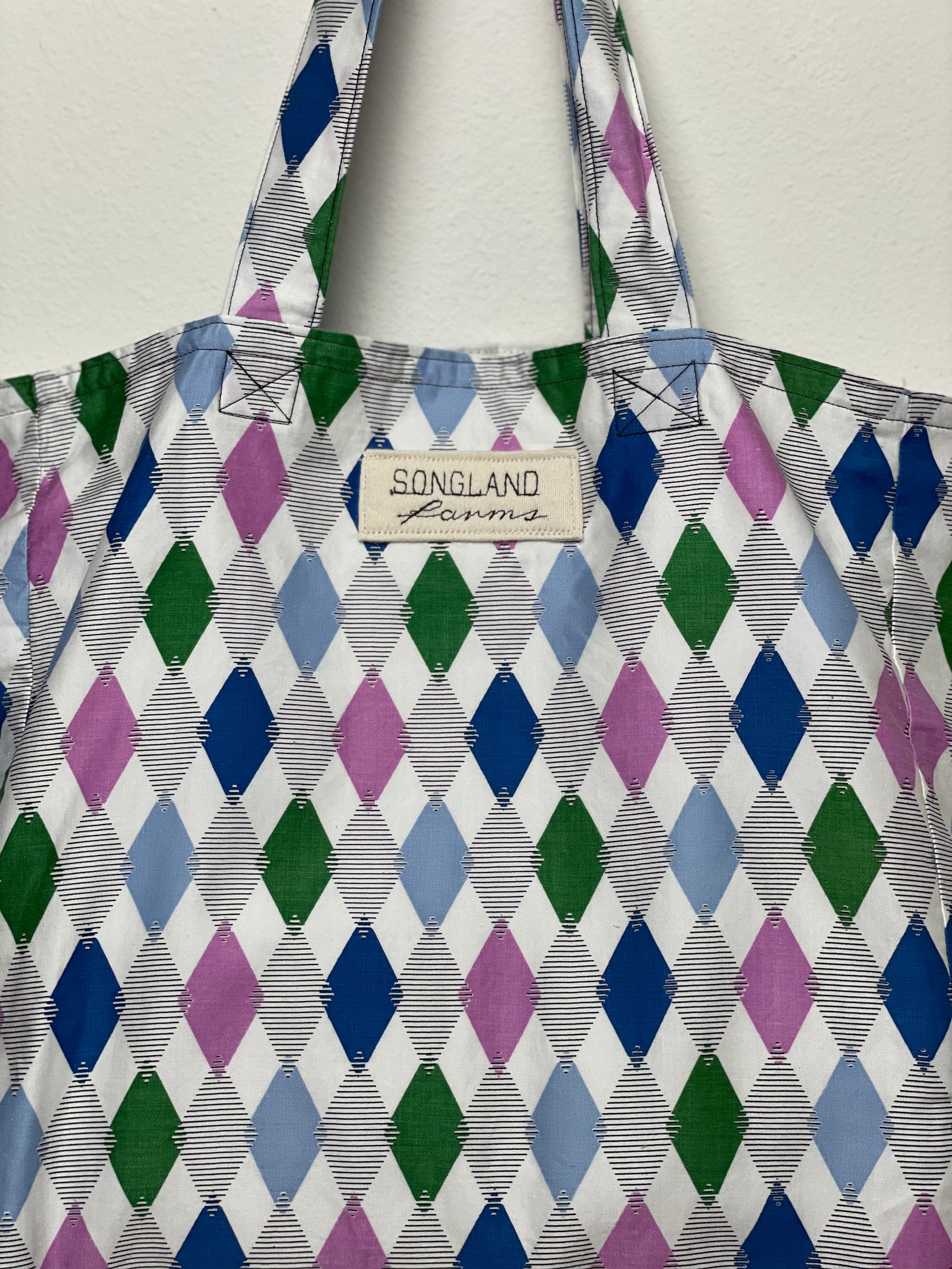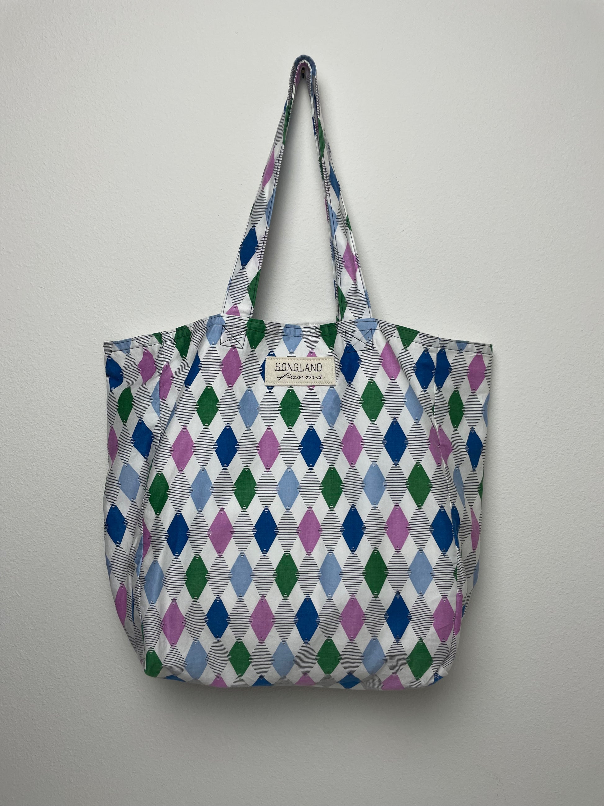 Handmade from vintage Waverly Bonded “Jamboree” fabric in shades of blue, green, lavender, and white, this tote is fully lined and built for everyday use. The print features a repeating diamond pattern with alternating solid colors and fine striped details, giving it a playful, geometric look. The crisp white background makes the colors stand out cleanly, while the simple shapes create a light, cheerful feel. Made using repurposed fabric, it blends a bright, mid-century inspired textile with a clean, functional design perfect for groceries, books, or daily essentials.