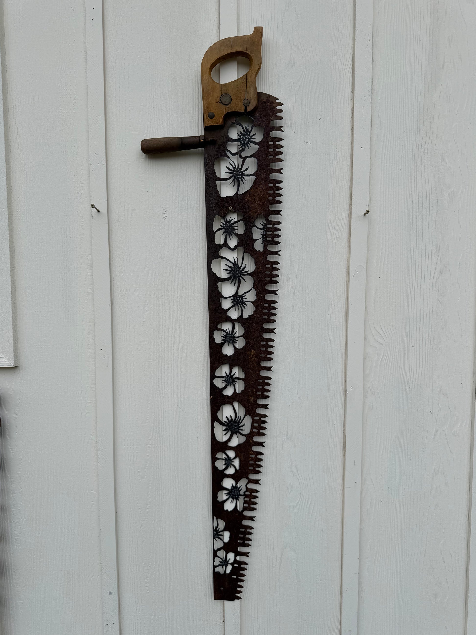 Larger vintage saw with a floral design. plasma-cut by hand