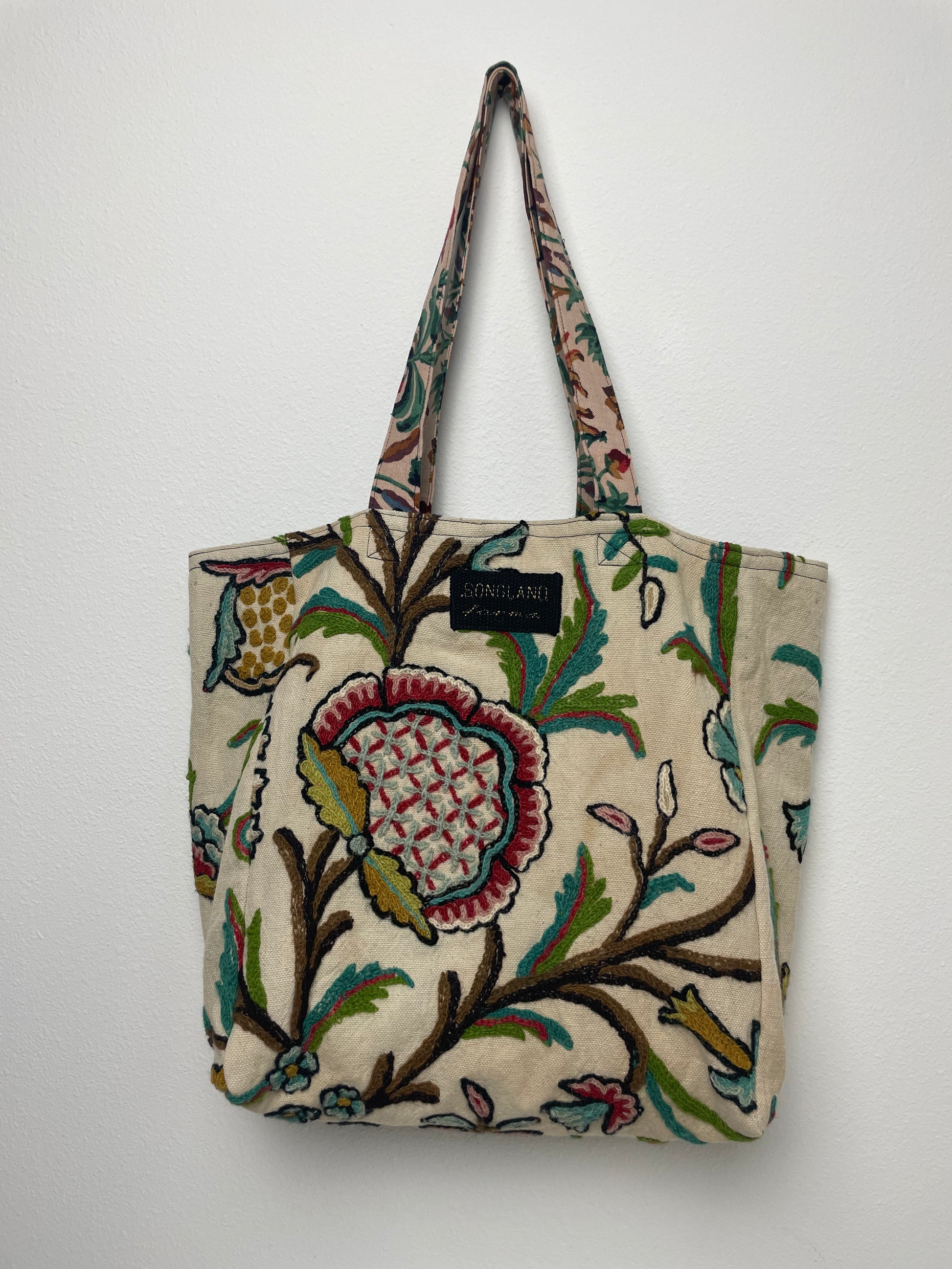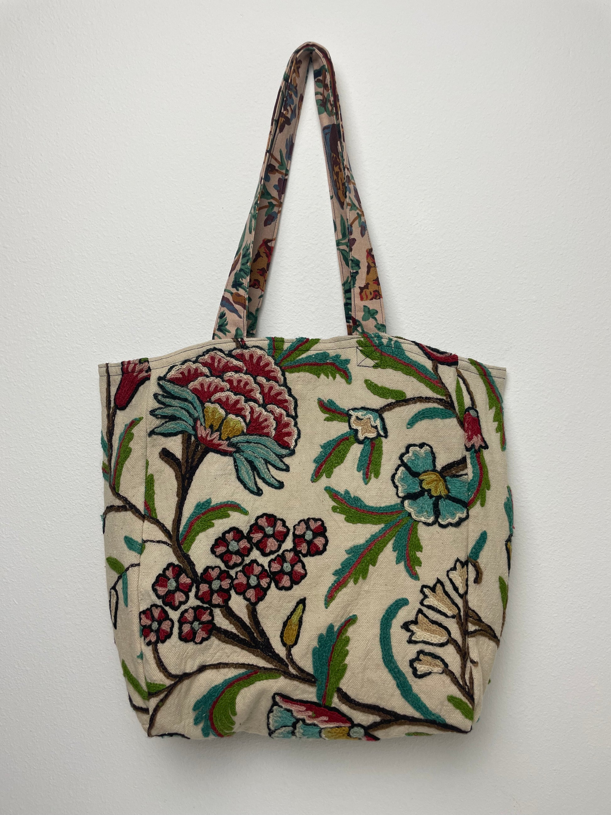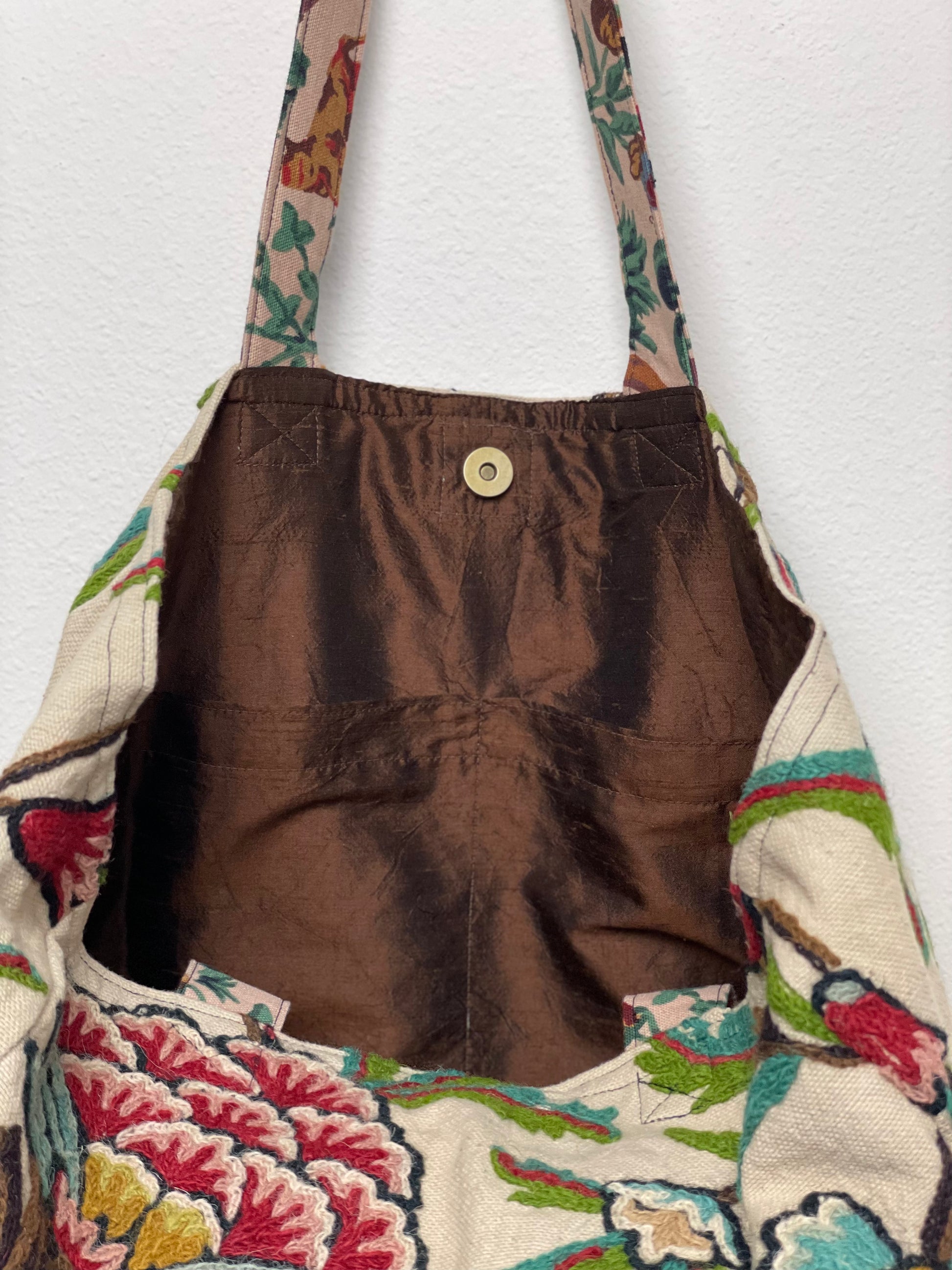 Handmade from vintage Wool Crewel embroidery fabric in cream, deep red, sage, teal, gold, and brown, this tote is fully lined with luxurious Dupioni silk and built for everyday use. The Indienne-style pattern features winding vines, stylized florals, and textured Wool Crewel embroidery that gives the fabric depth and a handcrafted, heritage look. The bag closes with a magnetic snap, and inside you’ll find a large double pocket for organizing keys, a phone, and other essentials. Made using repurposed fabric, it blends a traditional vine-and-bloom textile with a clean, functional design perfect for groceries, books, or daily use.