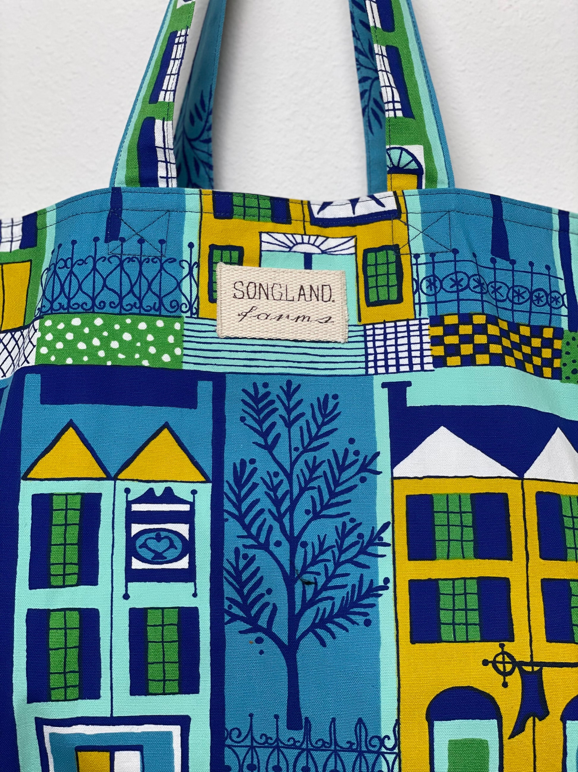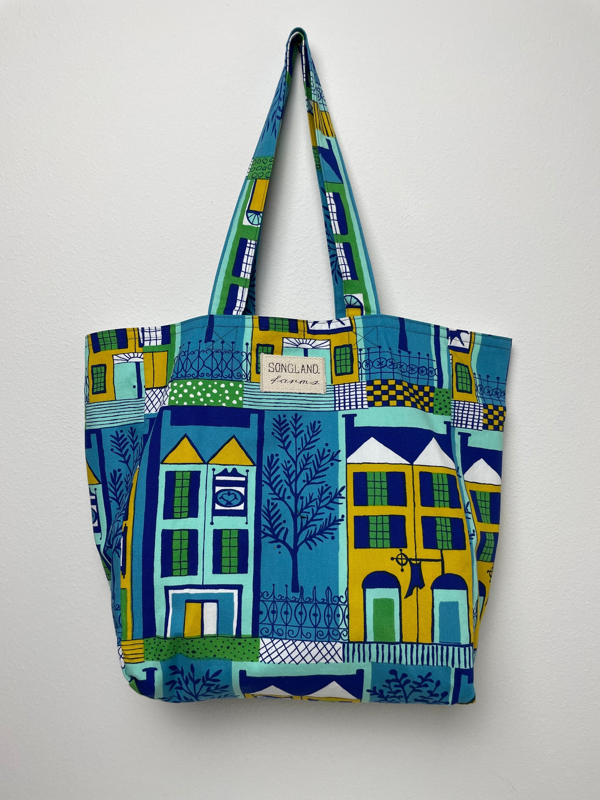 Handmade from vintage Savalux fabric in shades of teal, sky blue, navy, chartreuse, and white, this tote is fully lined and built for everyday use. The print features a playful row of stylized townhomes with tall windows, pitched roofs, and geometric details, along with dotted greens and hand-drawn trees that create a lively, mid-century illustrated feel. The bold blocks of color and clean outlines give the pattern a crisp, graphic look while still feeling warm and whimsical. Made using repurposed fabric, it blends a distinctive architectural motif with a clean, functional shape perfect for groceries, books, or daily essentials.
