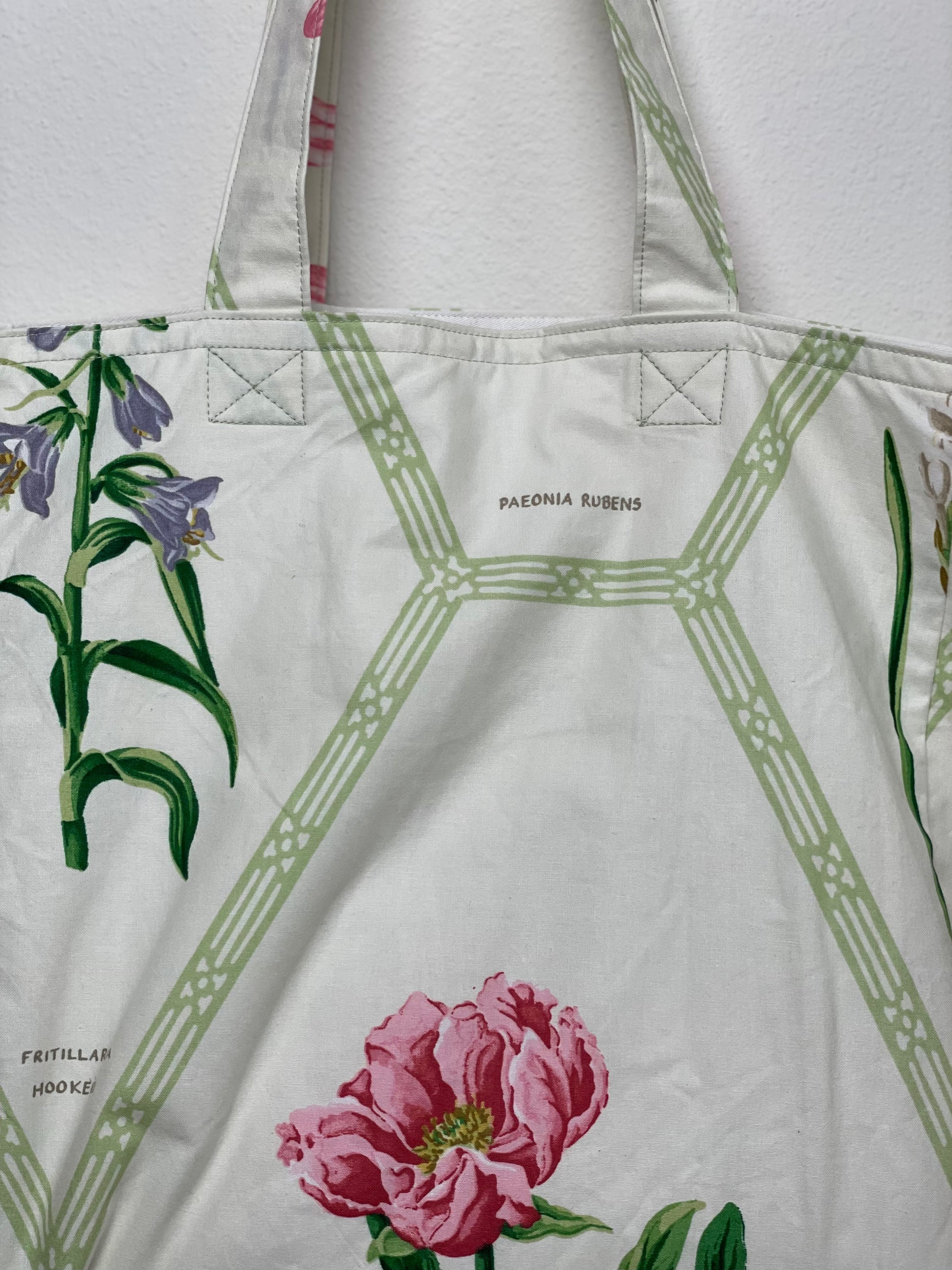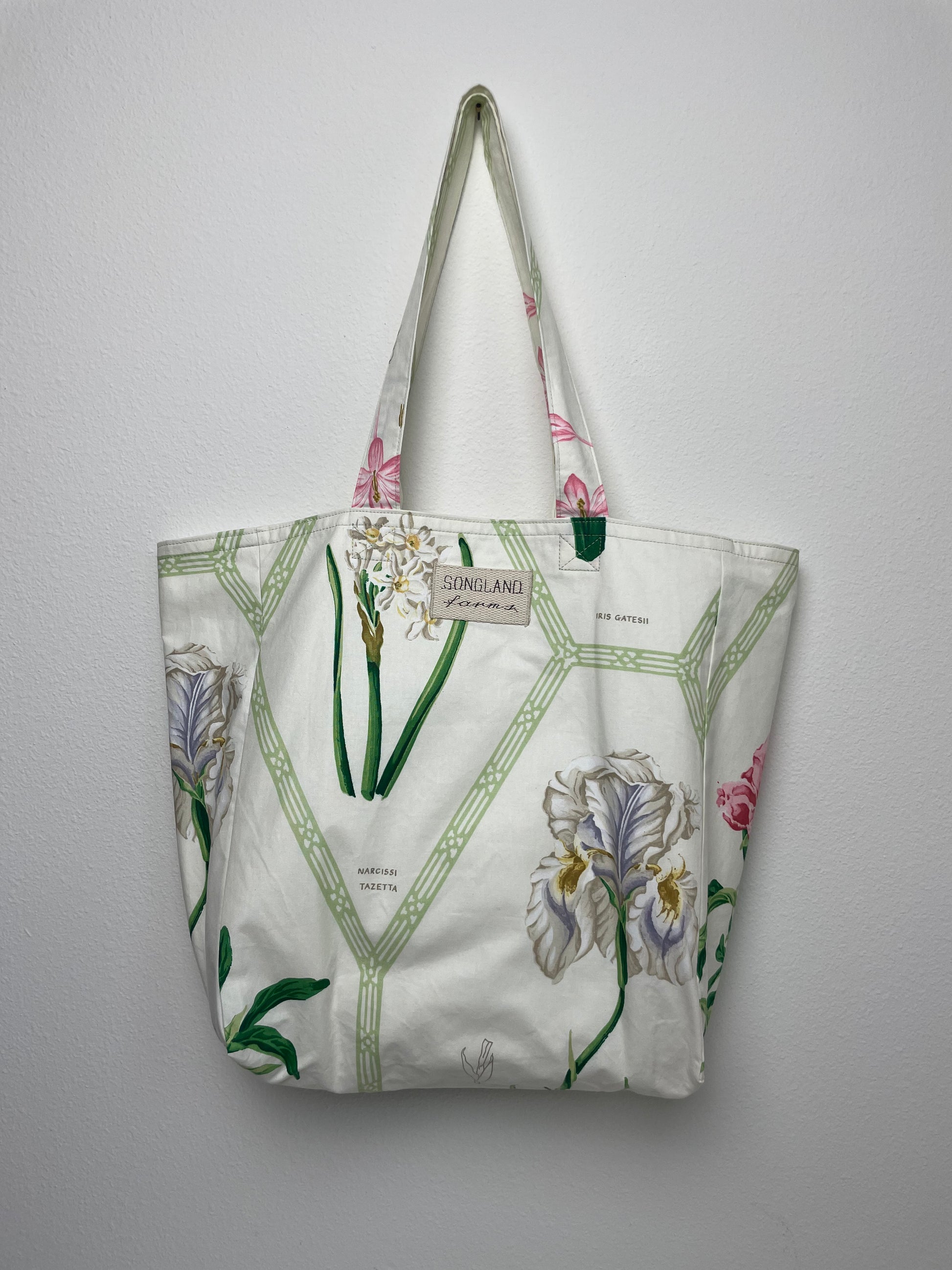 Handmade from vintage Schumacher “Ivydene” cotton fabric in soft white, sage green, lilac, blush, and golden yellow, this tote is fully lined and built for everyday use. The print features botanical illustrations of irises, narcissus, and other garden blooms framed by a pale green lattice, giving the fabric a refined, archival look. The delicate floral details and airy background make the pattern feel fresh and elegant without being overly busy. Made using repurposed fabric, it blends a classic Schumacher botanical with a clean, functional design perfect for groceries, books, or daily essentials.