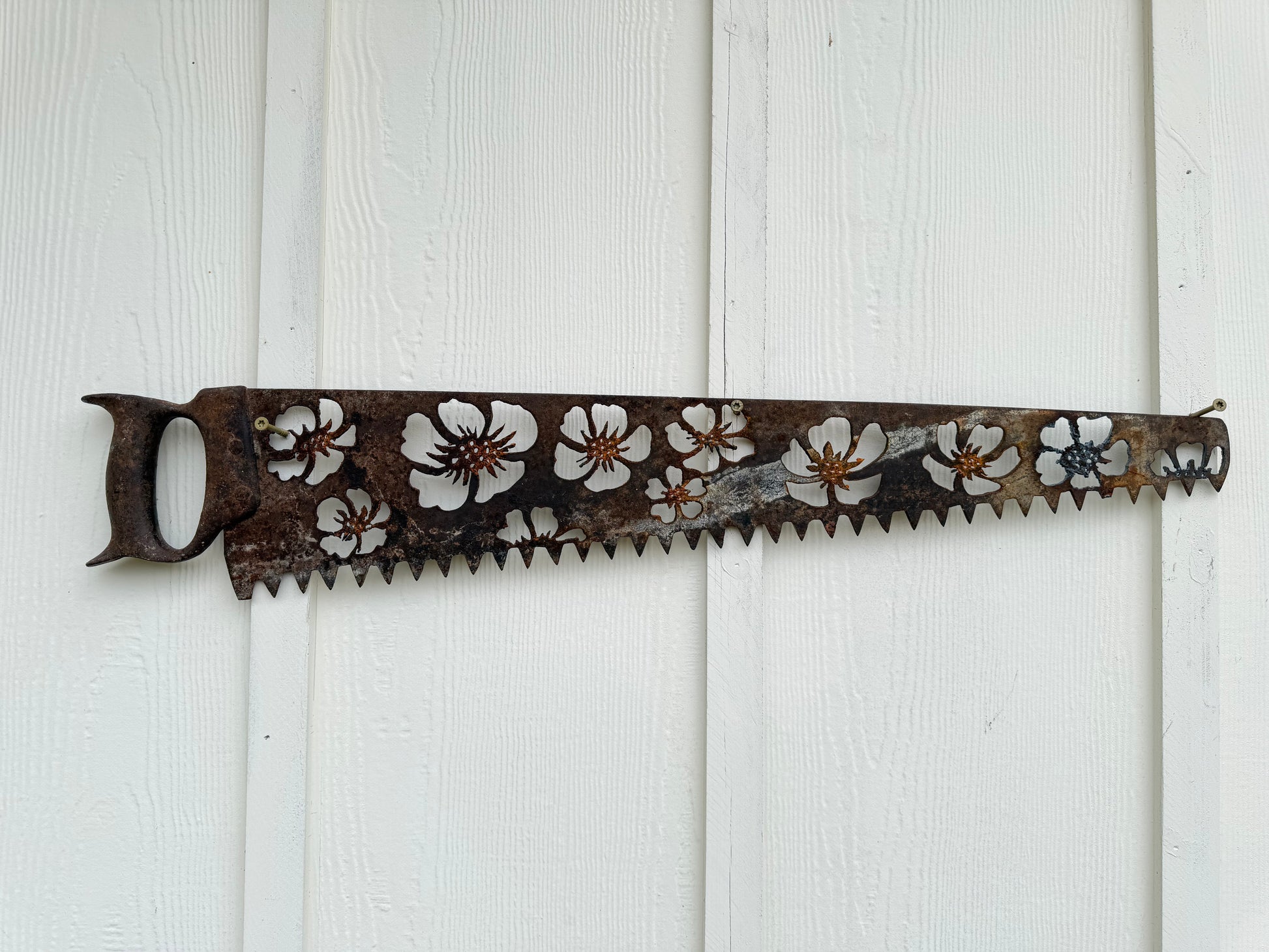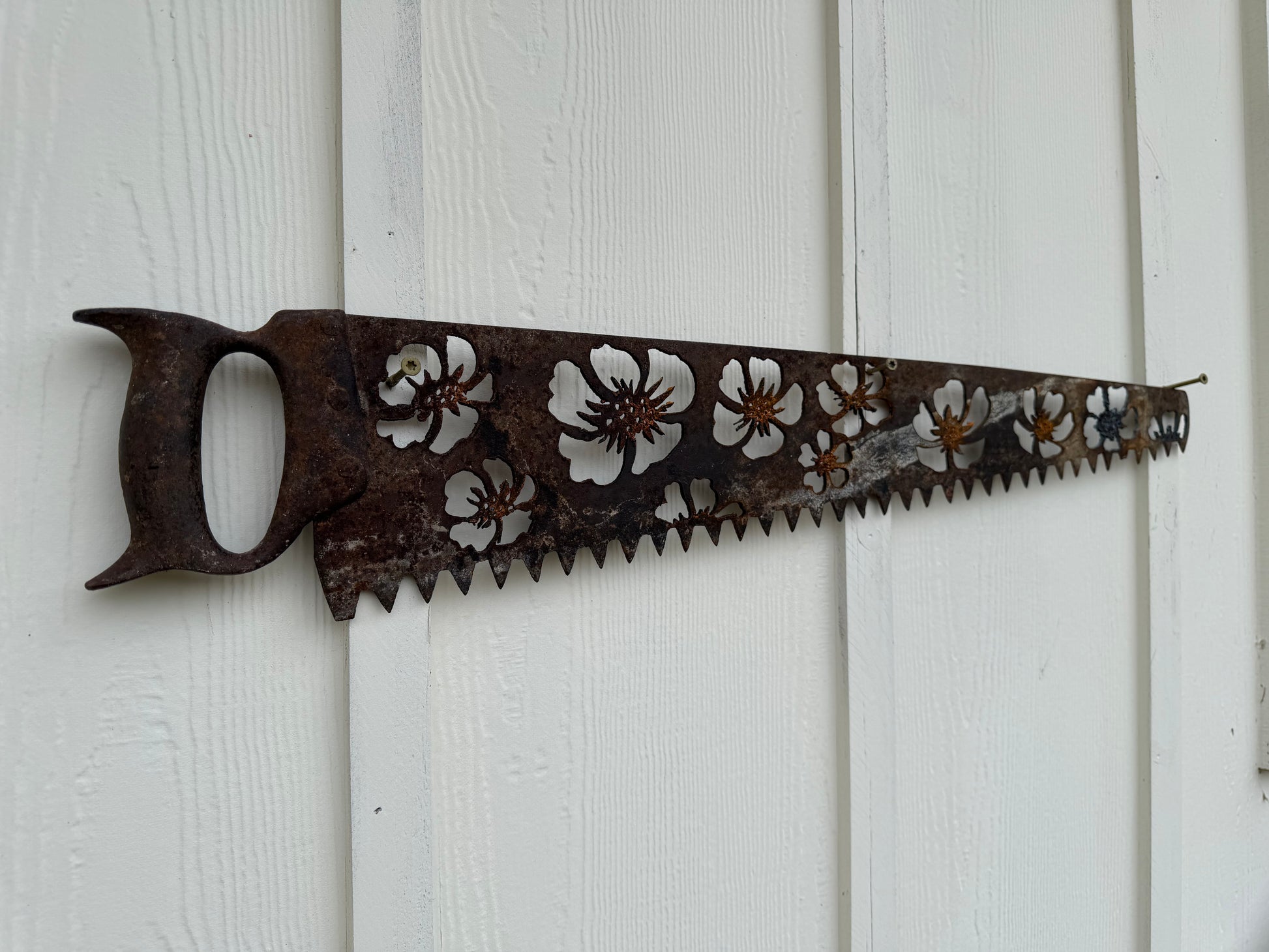 Thick Vintage ice saw with metal handle. Plasma cut by hand - floral design.